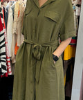 Abito chemisier modello sahariana con cintura in vita, chiusura frontale con bottoncini, manica corta.