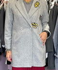 Cappotto sfoderato taglio morbido lunghezza sopra al ginocchio, impreziosito da spille e patch.