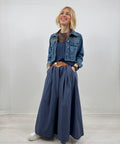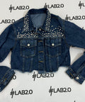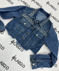 Giacchetto denim taglio crop reso unico dalle applicazioni scintillanti.