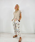 Comodo pantalone in fresco tessuto con tasche ed elastico in vita.