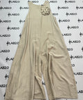 Tuta intera dal fit morbido con zip dietro la schiena, arricchita dalla spilla a fiore.
